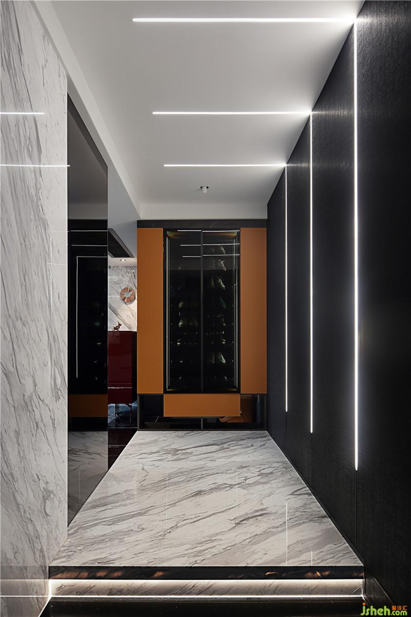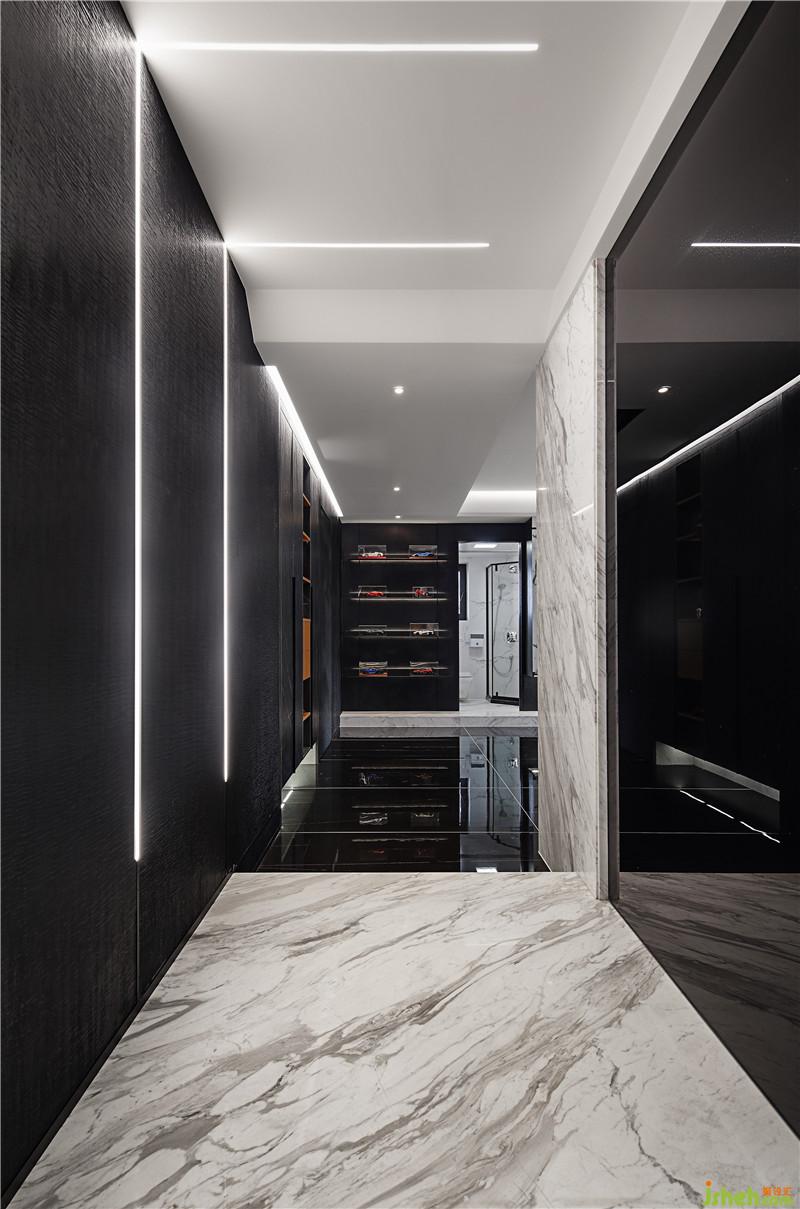 這個(gè)角度能夠比較完整地看出黑色與白色的配比以及地臺(tái)層次的呼應(yīng)銜接關(guān)系。地臺(tái)的燈光也為整個(gè)空間增添了氛圍。
