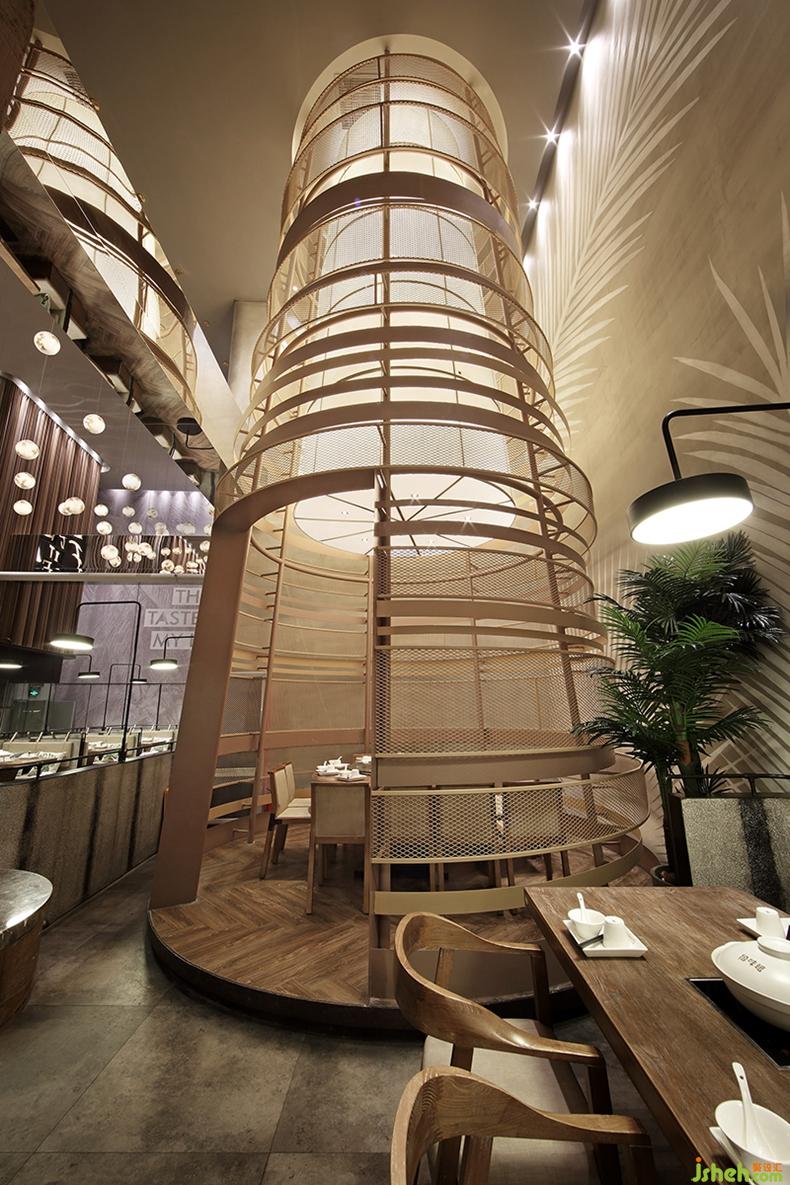 除此之外,設計師提取椰樹元素,利用原有建筑10米層高的特點,用黃銅打造出椰樹形態(tài)的裝置,一圈一層黃銅纏繞,形象生動的刻畫了椰樹桿的自然肌理,在滿足包間功能的基礎上,為空間創(chuàng)造出獨有的藝術裝置,在提升藝術感同時也增添了一種宏偉的視覺感受。餐廳設計