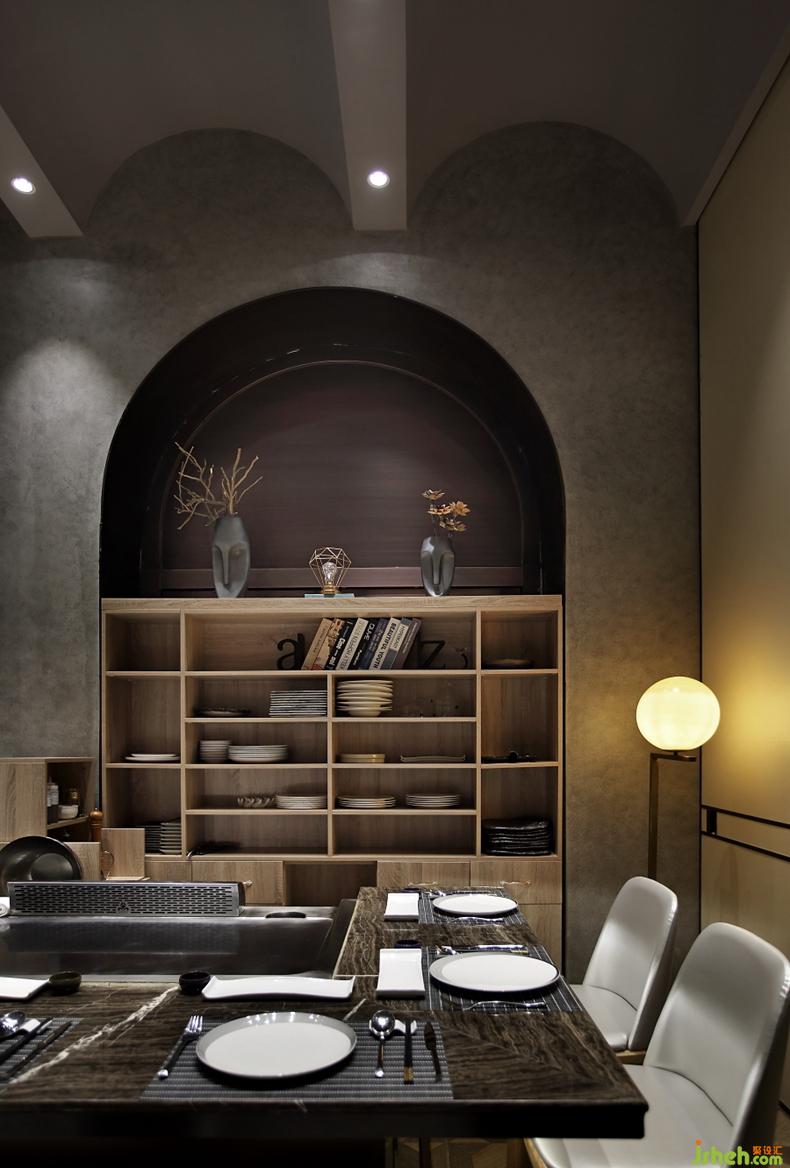 包間內(nèi)設(shè)計(jì)入墻拱式壁櫥,既有陳列美感、亦有置放餐具的功能,配有典雅的瓷器擺件。法式風(fēng)情裝飾畫、仿夜明珠的壁燈點(diǎn)綴墻上,營造就餐區(qū)的靈動(dòng)格局,顯得精致愜意。有意留置這樣一處空間,此時(shí)此境,閑暇之余,忘卻城市喧囂煩憂,在內(nèi)用餐的客人仿佛浮生偷得一日閑。餐廳設(shè)計(jì)