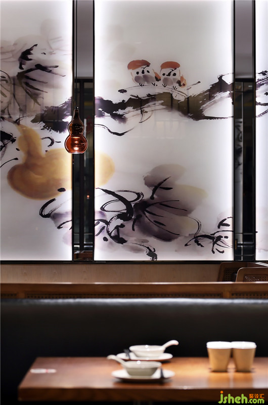 空間開篇的點(diǎn)睛之筆,便是一副墨趣橫生的【難得葫圖】,枝繁果碩,寓意興旺美滿,將中國人的樂活哲學(xué)授予往來食客。門頭處巧妙引入本地造化靈秀的山水微景,藏風(fēng)聚氣,將東方的福瑞涵蘊(yùn)不動聲色地延展開去。