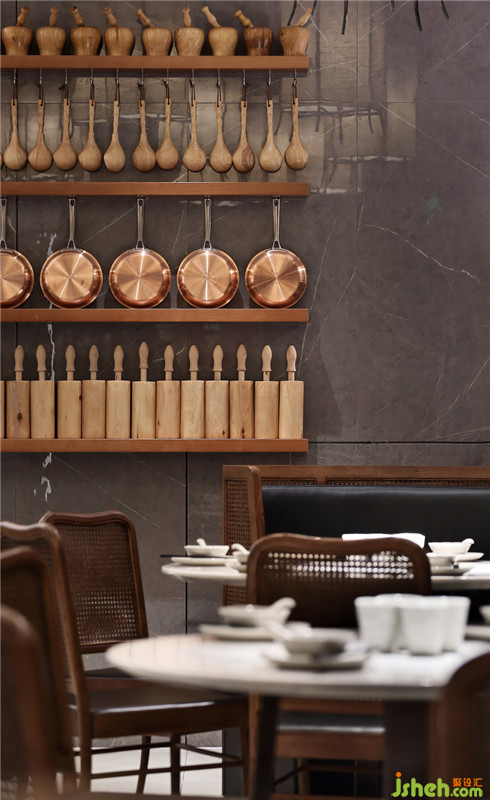 設(shè)計師走訪三峽之地,從古建筑中汲取靈感,將千百年來藏匿于屋檐下的斗拱重新創(chuàng)作,以另一種頂天立地的方式存在于空間,不止是陳列食材餐具,更是盛載著人們對過往的眷戀。餐廳設(shè)計