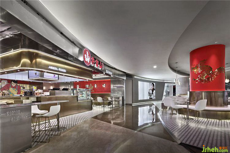 本案設(shè)計(jì)以傳承為依托,運(yùn)用簡潔明快的方式呈現(xiàn)新潮時尚的甜品文化。在許留山的空間演繹上,龍紋和朱砂紅的搭配,賦予了空間濃郁的文化氣質(zhì);