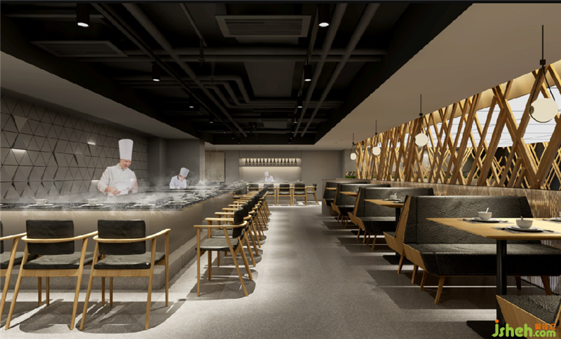 開闊的大廳、開放的明檔、簡約的燈箱、硬質(zhì)的鋼板、格調(diào)包間和雅致過道……多種材質(zhì)的巧妙配合,營造出日式簡約空間,給人輕松浪漫的感覺。餐廳設(shè)計