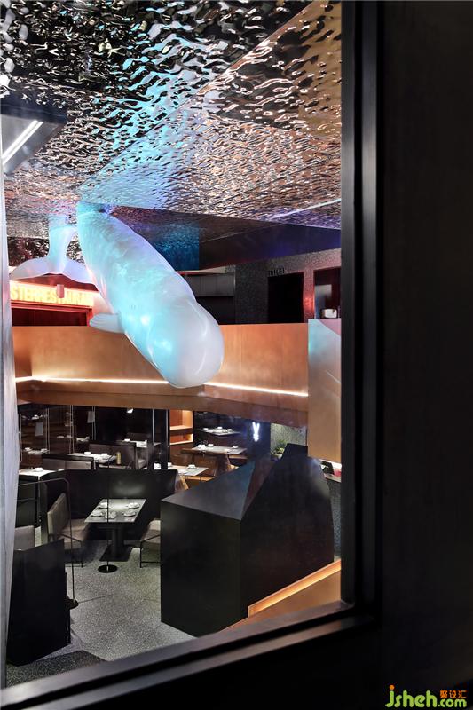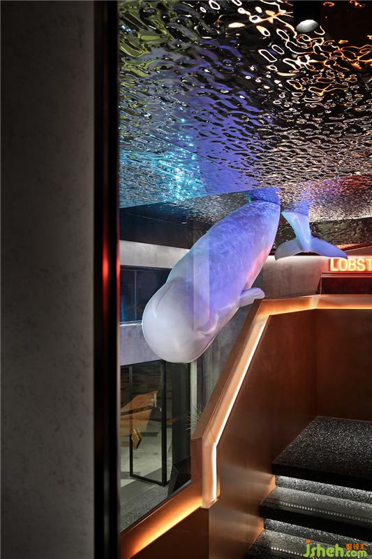 進(jìn)入餐廳,寓意海洋世界的天花造型就映入眼簾,大鯨魚從海平面一躍而起,珊瑚和小魚驚得四處逃竄,人置身其中,宛如遨游在廣闊的海洋中,給人震撼感的同時(shí)又賦予空間自在悠然的氣度。餐廳設(shè)計(jì)