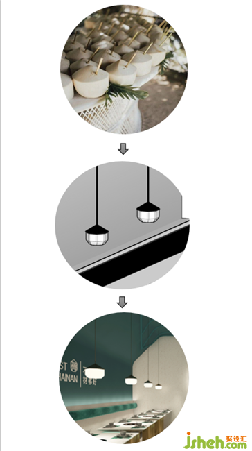 從“椰殼”走進(jìn)椰子里,又見一片蔚藍(lán)的海灘風(fēng)光??臻g里,大到門頭和隔斷,小到屏風(fēng)和燈籠,都是品牌元素潛移默化的滲入和應(yīng)用。餐廳設(shè)計(jì)