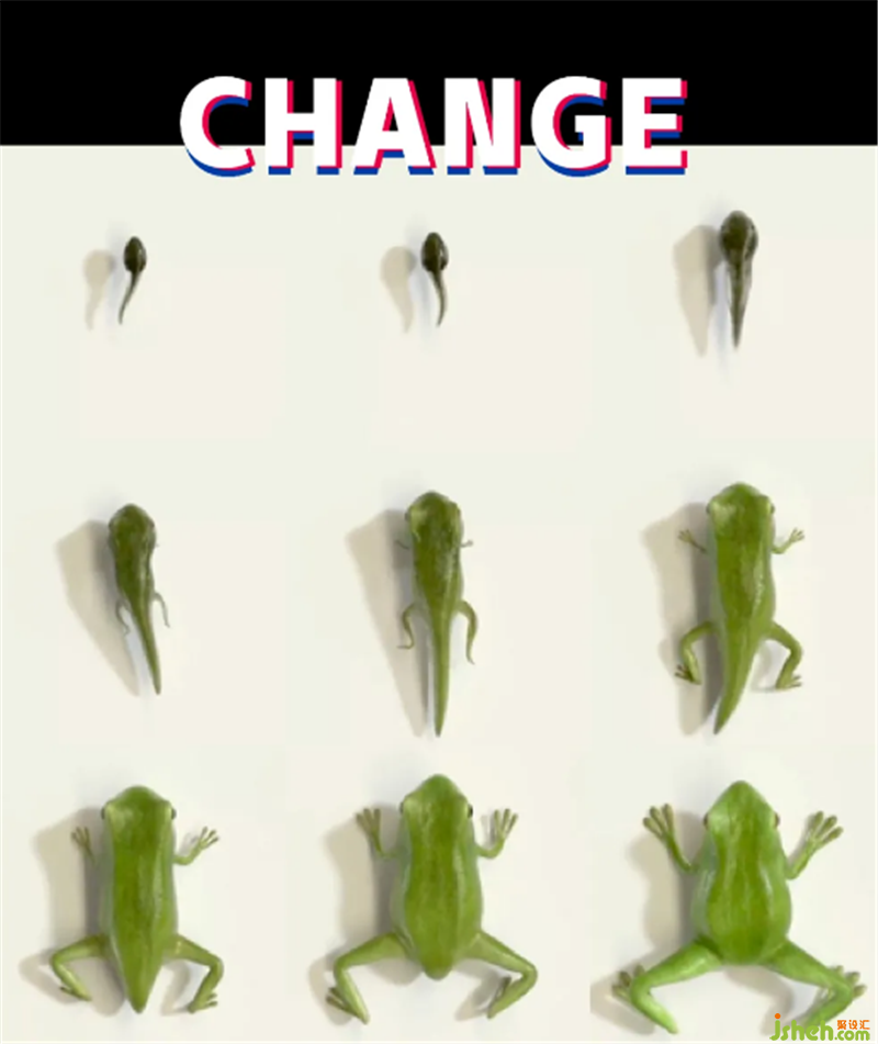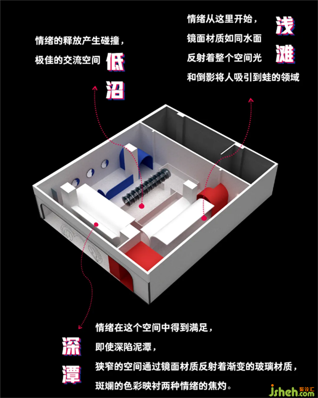 本案餐廳設(shè)計圍繞「蛙來噠」中的“蛙”開展。蛙的生長繁殖從幼體到成熟體,每個階段都是完全不同的體態(tài),從深潭到低沼,從低沼到淺灘。每個成長階段對應(yīng)不同的水域,蛙每時每刻都在發(fā)育變化,最后蛻變?yōu)閮蓷珓游?。我們的生活又何嘗不是如此,在面對不同的場景,都會有不同的人格情緒。每個人都是一個多面體,但每個情緒都是我們所真實擁有的自我。