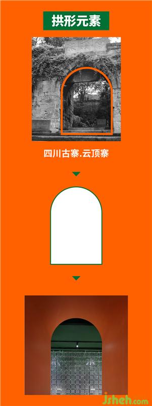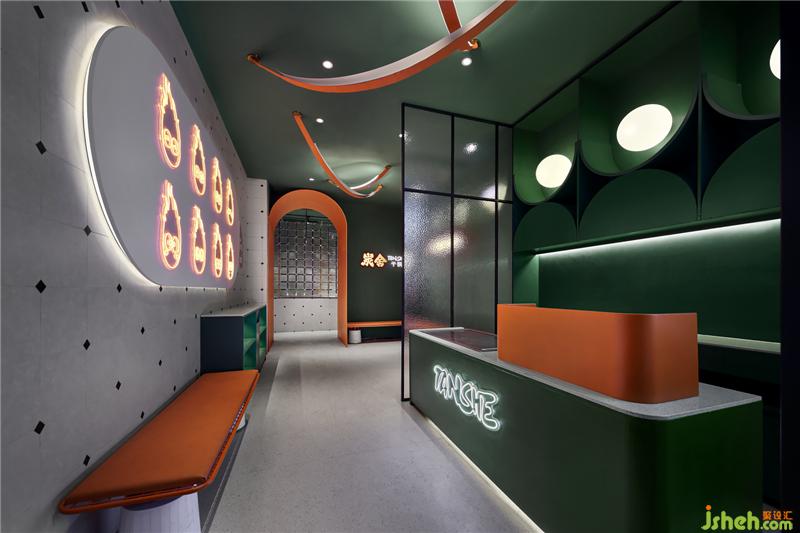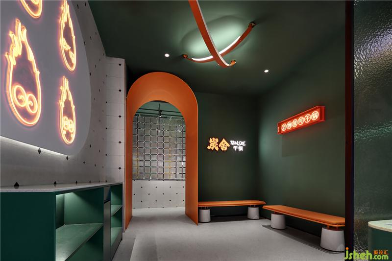 從極具代表性的四川云頂寨中提煉出“拱”+“雀替”符號(hào),將炭舍的品牌橙色+主打藤椒產(chǎn)品的藤椒綠設(shè)為空間主色調(diào)。