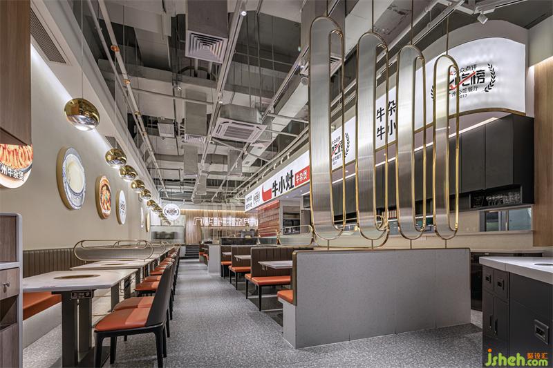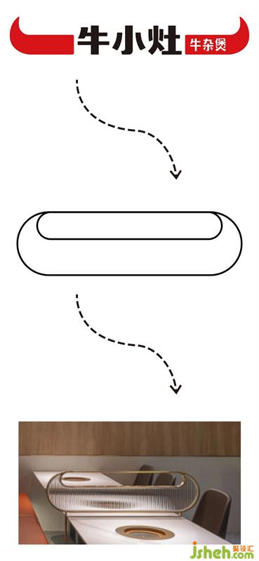 門頭是空間視覺的第一記憶點大牛角符號形象生動也能令人產生“大牛角=牛小灶”的自然聯(lián)想進而讓牛小灶品牌文化在人們印象中巧妙嫁接強化視覺錘的表現(xiàn)力 本案室內設計以牛角元素為核心大大小小的牛角符號在空間布局里有計劃有策略地陳列一步步深化品牌印象