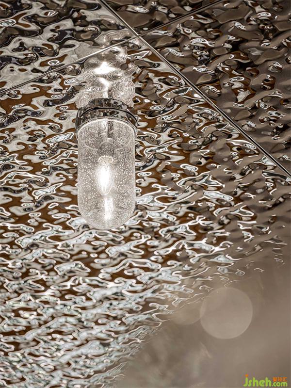 右邊區(qū)域地天花仍舊搶眼,木紋鋁通材料對木板的溫性亦步亦趨,圓形中有方格,方格中帶三角,又以十字結(jié)構(gòu)斜街,寓意中西方文化融合的痕跡。該區(qū)域色彩豐富,可謂絢麗奪目,被點亮的招牌菜綻放如花朵,恨不得渾身染著香氣,吸引顧客。實木飾面拼貼出巧克力墻,奇妙地從視覺上給人甜蜜的感覺.