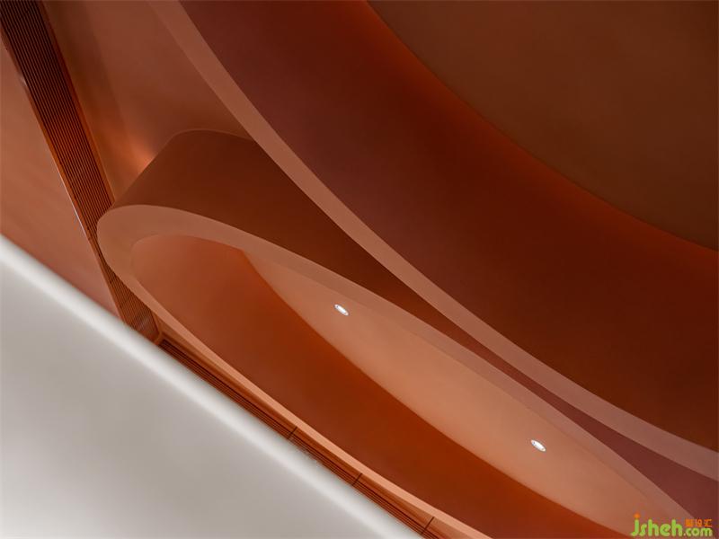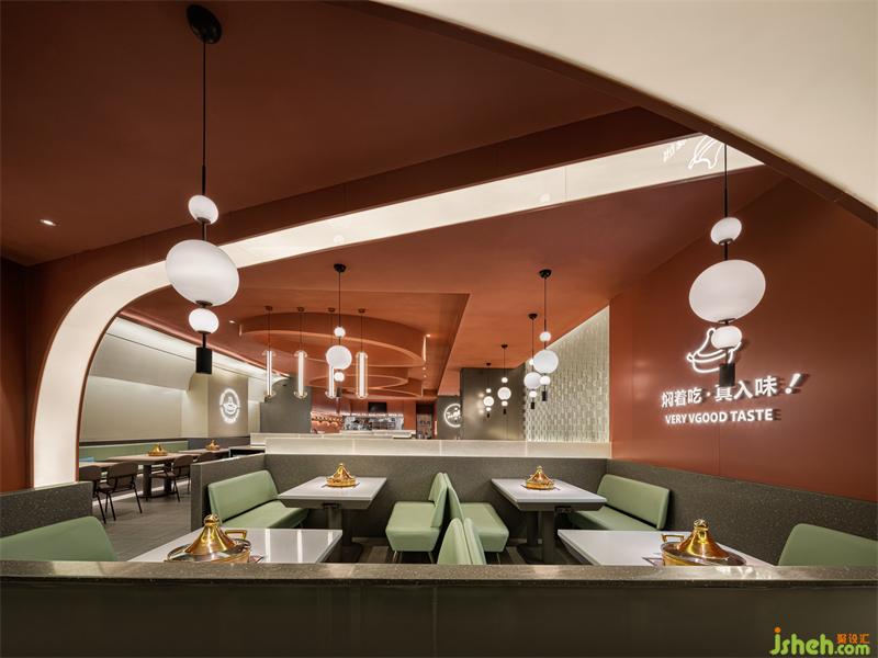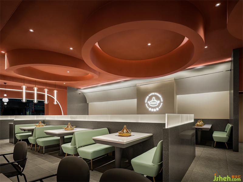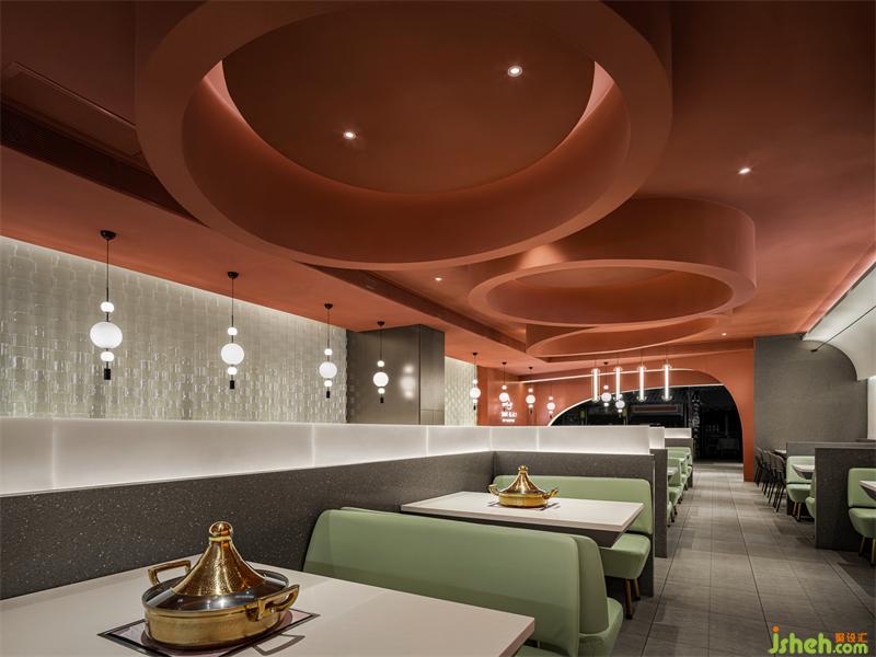 茶色天井營造出宮殿用餐氛圍,墻面造型是傳統(tǒng)屋檐的抽象賦形,呼應(yīng)著門頭的拱弧元素空間主色取自中國古建筑。大面積的茶色搭配練色,餐廳設(shè)計(jì)以銅綠為點(diǎn)綴,視覺上十分簡約。