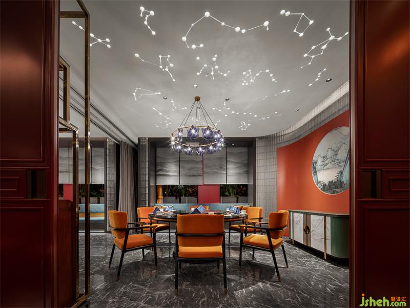 會所設(shè)計沿著契合故宮建筑對稱美的過道,來到大小包房。圓桌居中,桌椅圍擺,山水屏風(fēng)造近景以呼應(yīng)窗簾上層層疊疊的遠(yuǎn)山與云霧風(fēng)景。大包間里,大理石的自然紋理以溫潤質(zhì)感,為空間打下沉著內(nèi)斂的基調(diào);大吊燈華光璀璨,是氛圍烘托、營造場景的能手;相連的星宿圖將囊獲寰宇的視角,投射在天花上。