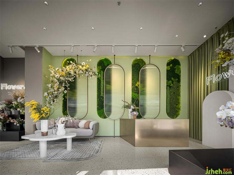 素雅的室內(nèi)佈局為花卉搭建出展示舞臺,壁上框景展示草木之美,鏡面造景反射花容之姿,亞克力借景半遮半掩,洩露花卉若有似無的秘密。