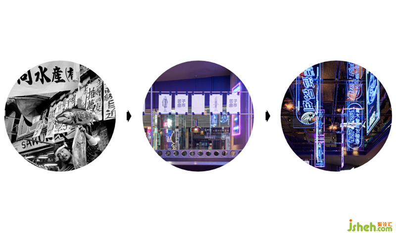 魚市中的吊旗和裝貨箱元素被轉(zhuǎn)嫁到室內(nèi)空間。吊旗以霓虹燈的形式出現(xiàn)在空間的中庭,集裝箱符號(hào)陣列出墻體,集市的氛圍瞬間拉滿。