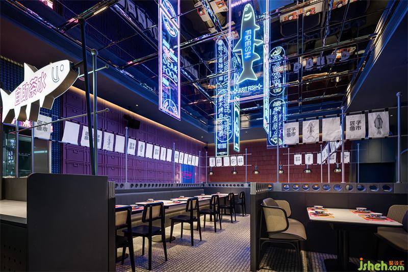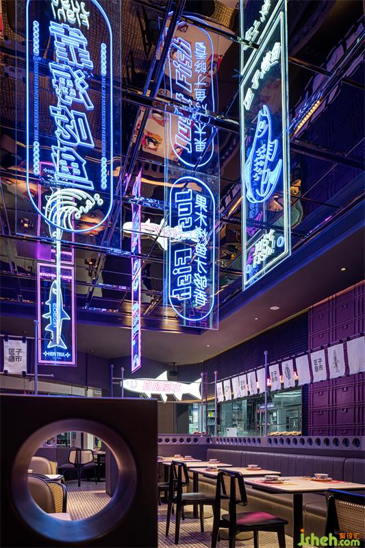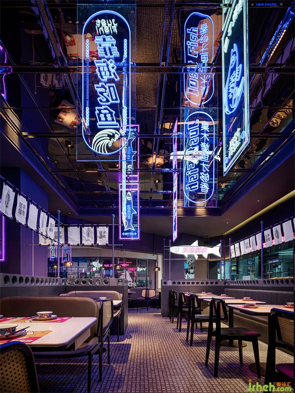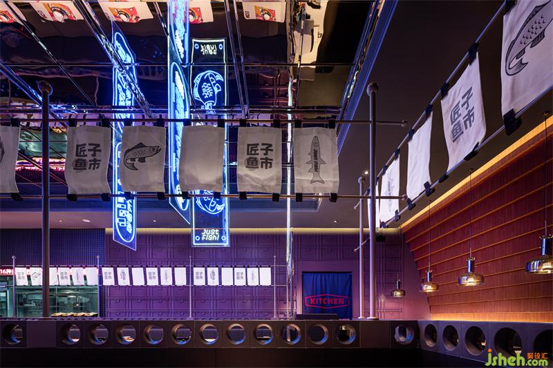 地面有馬賽克方磚模擬石材的質(zhì)地,進(jìn)而模仿魚(yú)市的常用材質(zhì),營(yíng)造質(zhì)樸自然、輕松愉悅的餐飲氛圍;
