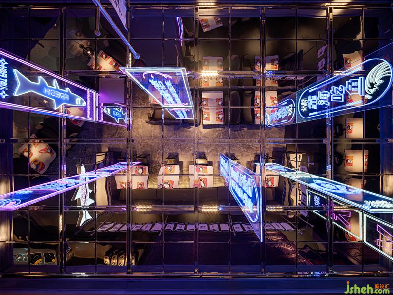 天花是鏡面全景覆蓋,視覺(jué)上延展著室內(nèi)空間,讓設(shè)計(jì)效果倍增,倒影出一個(gè)觸手可及的夢(mèng)幻霓虹世界。
