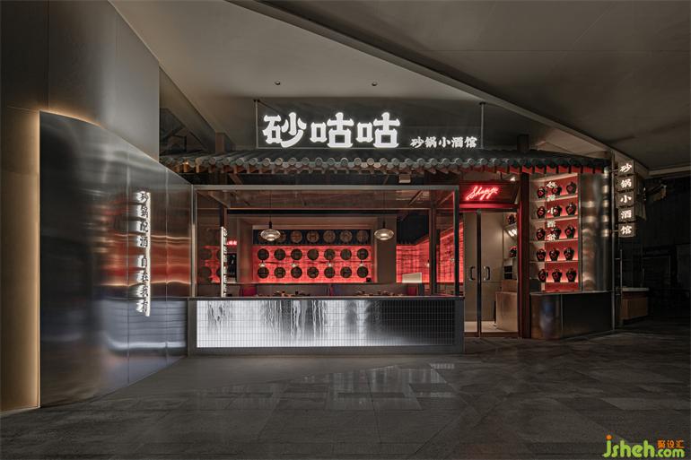 餐廳空間內(nèi)的設(shè)計語言也從“炭火爐+酒器”中提?。荷板佁炕馉t中,星火暗涌,點(diǎn)點(diǎn)赤紅;砂鍋里,熱氣縷縷,彌漫四方;酒器上,取形為用,序列組合。濃烈的江湖氣與砂鍋美食文化碰撞融合。