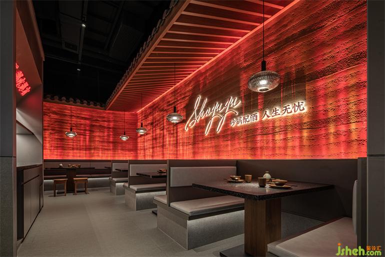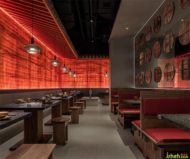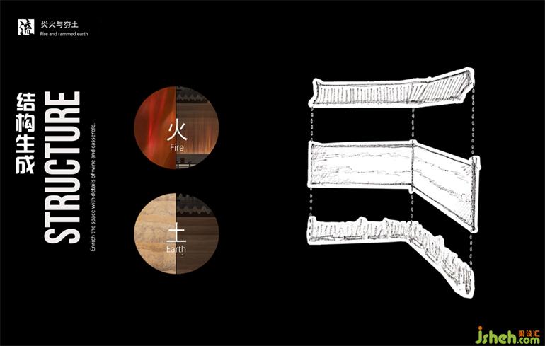 火生土,火與夯土也從火爐而來,暗涌之火,熱烈而激情,升騰于夯土之上,小酒館設(shè)計(jì)由動(dòng)態(tài)火紋燈模擬,豐富表現(xiàn)形式的同時(shí)詮釋出動(dòng)靜結(jié)合、自成一體的空間印記。