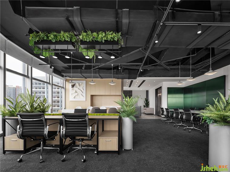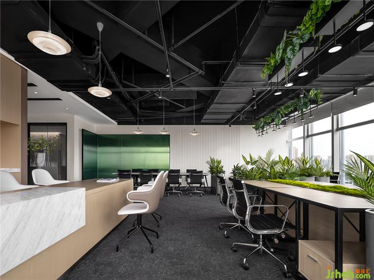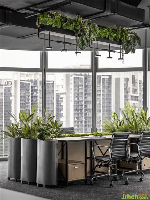 溫暖親切的原木色融合天然的綠,編織著如新加坡花園城市般清新旖旎的空間肌理。蓬勃的綠植被巧妙地布局在辦公圍擋、天花吊頂?shù)葏^(qū)域,迸發(fā)的綠色基因?qū)⑸罾硐胙b入日常辦公中。