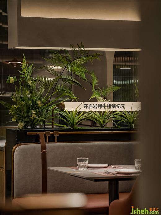 清新溫潤的綠植詮釋自然美學主義,蔓延中悄然淡化空間的清冷與疏離感。一花一葉安靜地守候一隅,具有鮮明品牌印記的裝飾燈管淺淺藏匿于草叢,深圳餐廳設(shè)計將御牛紀的故事向食客娓娓道來。