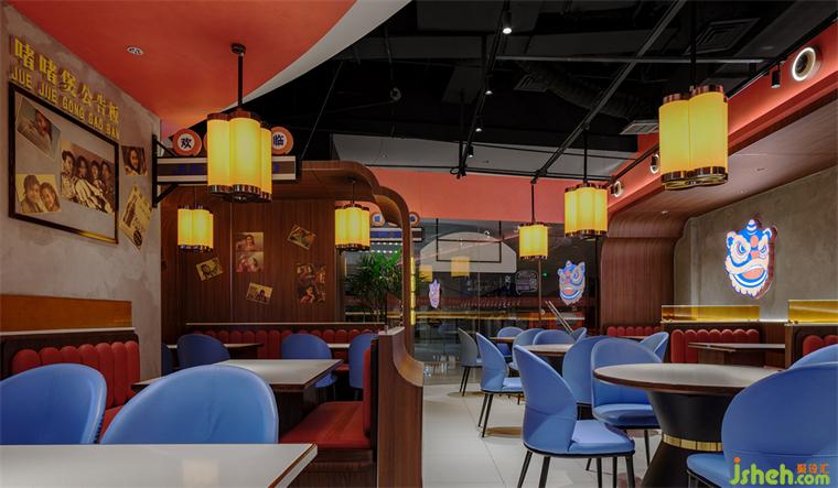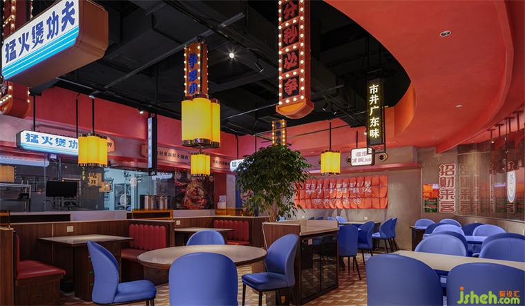 紅色,蘊含現(xiàn)代廣東人喜愛的大吉利是、興旺發(fā)財?shù)暮貌暑^。藍(lán)色,嶺南建筑鐘情的淺淡基調(diào)。二者相互映襯,餐廳設(shè)計以冷暖對比強烈卻不違和的茄紅色和翠藍(lán)色成為空間主色調(diào)。