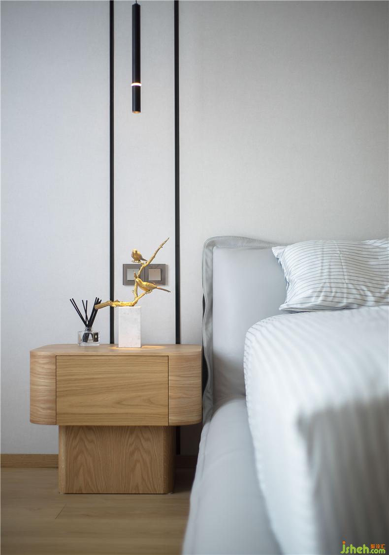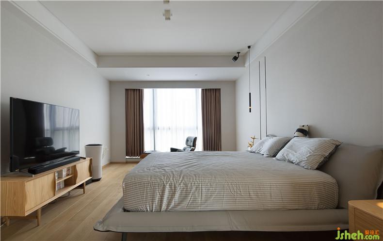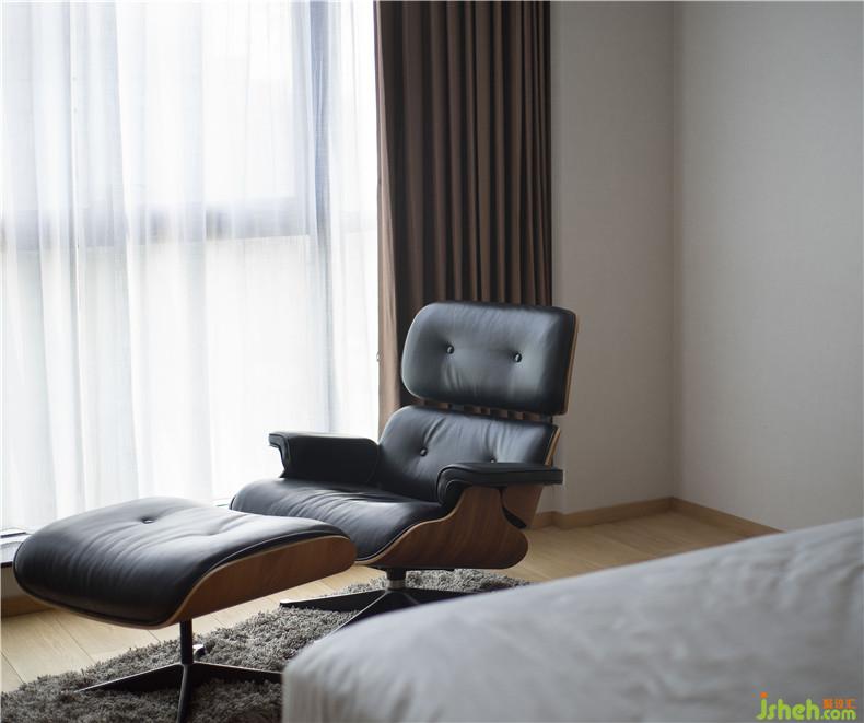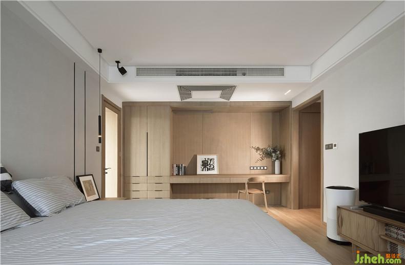 主臥室室內(nèi)設(shè)計(jì)師考慮到業(yè)主繁忙的管理工作和個人愛好,做了一個非常開放的大長臺案,既可以作為書桌、也可以堆放、掛放衣物、也可以擺放林總喜歡的動漫玩偶。這是一個比較開放自由的功能。