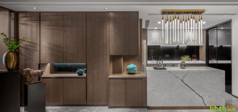 業(yè)主常年海外國內(nèi)交替居住,比較喜歡西餐咖啡、加上度假住宅,平時基本就兩人用餐,所以廚房區(qū)做了開放的西廚和右側(cè)封閉的小中廚(中廚房是原有的設(shè)備陽臺改造而來),業(yè)主非常喜歡在吧臺用餐,所以室內(nèi)設(shè)計(jì)師在客廳和西廚之間自然橫置了一個雕刻白石材吧臺,在形態(tài)組織上延伸了儲藏酒柜、空間畫分上界定西廚與客廳區(qū)域分割。