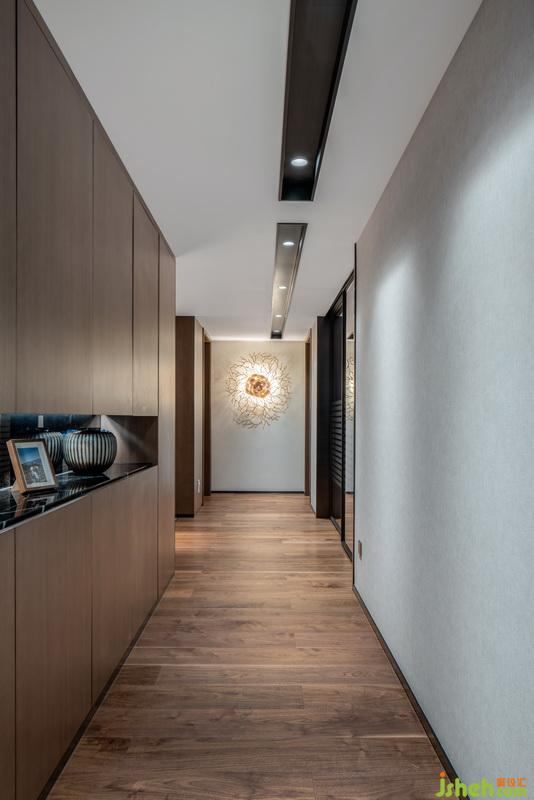 走廊空間室內(nèi)設(shè)計(jì)師利用亞麻壁紙與影木一起,形成柔和而雍容的質(zhì)感。