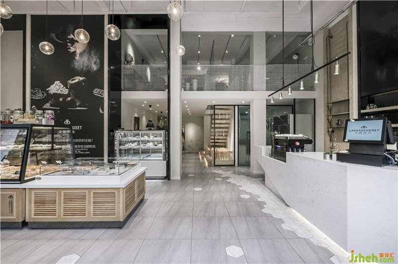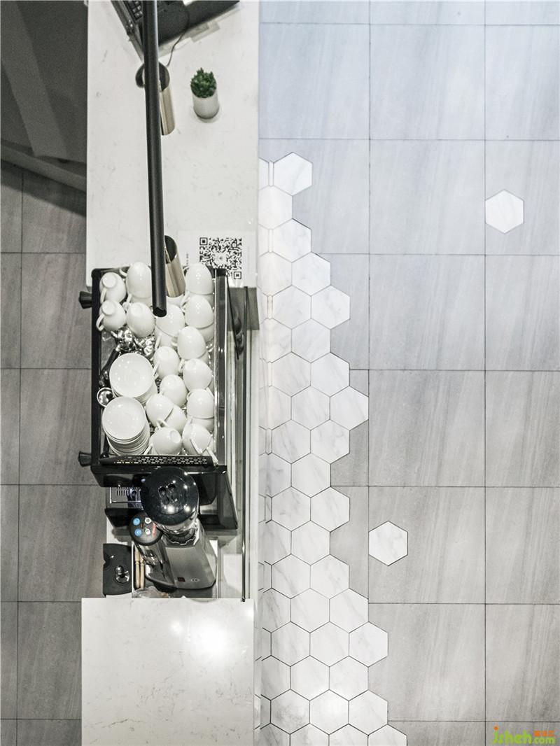 地板采用各種不同的拼接,形成視覺上的幾何美感。另外從吧臺(tái)區(qū)域整體看來,拼接的瓷磚像面包汁和果汁從吧臺(tái)流出濺落開來散落在每個(gè)角落,這也是一樓大廳的功能分區(qū)及消費(fèi)動(dòng)線引導(dǎo)。