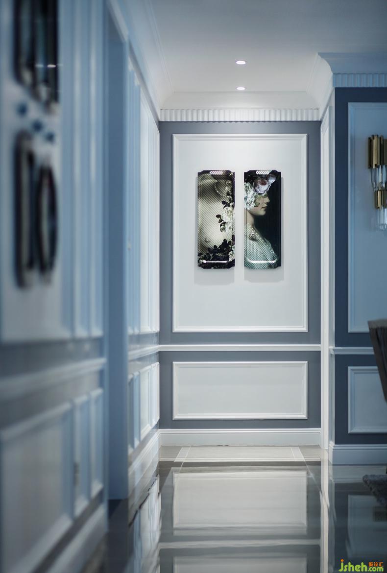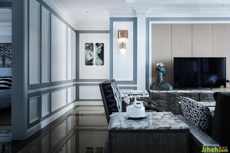 進(jìn)入客廳,宛如感受了現(xiàn)代與上世紀(jì)初巴黎藝術(shù)風(fēng)格在此邂逅。灰藍(lán)色與褐色構(gòu)成強(qiáng)烈的對比,通過水晶燈具的搭配,渲染上一層奢華情調(diào)。后現(xiàn)代風(fēng)格的壁畫、做工精巧的飾品、金屬線條的燈具,碰撞出極具韻律感的視覺沖擊,無不散發(fā)著奢華、雅致的空間氣質(zhì)。