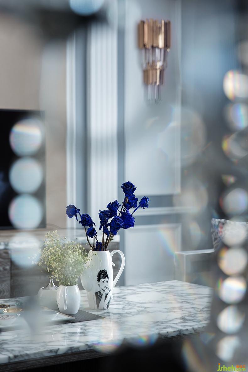 餐廳不失為整個(gè)空間的亮點(diǎn),搭配極富幻想的羽毛裝飾,打造出高雅輕靈的氣質(zhì)氛圍。藍(lán)與白的搭配,帶來極為舒適的視覺變化,互相融合交織共奏。輕嗅滿屋芬芳,隔著屏幕也能感受空氣中曼妙的甜香。