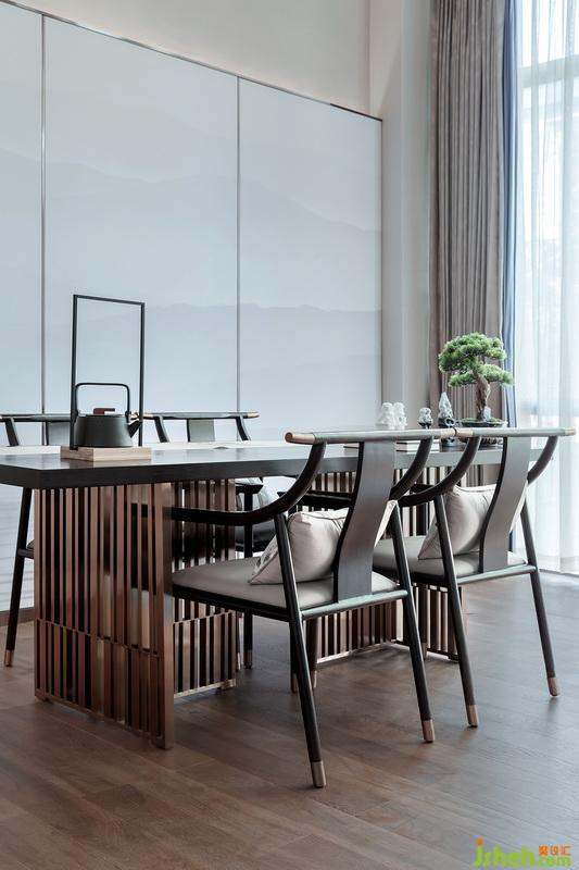 貴賓室墻面兩條金屬營造虛實相交的疏離感,于通透中增添了光影的流轉(zhuǎn),形成靜謐,內(nèi)斂平和的洽談氛圍。中間設(shè)立了一處長形茶桌區(qū),在這里感受一茶一世界,一壺一人生東方優(yōu)雅奢華的生活。