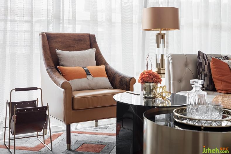 客廳重點突顯家具品質(zhì)在空間中的重要性,橙色的毛皮扶手椅是整個空間不安份的元素,造型舒展,仿佛向人發(fā)出邀請,落座瞬間,又有一種被溫暖環(huán)抱,擁有自己一片獨立私密的小天地的體驗??臻g以橙色為主色調(diào)開啟了“摩登”藝術(shù)之旅,由HERMES絲巾裝裱而成藝術(shù)掛畫流暢大氣,一抹橙色激活墻面的生活氣息,別致的家具也處處透著主人的身份與生活品質(zhì)。