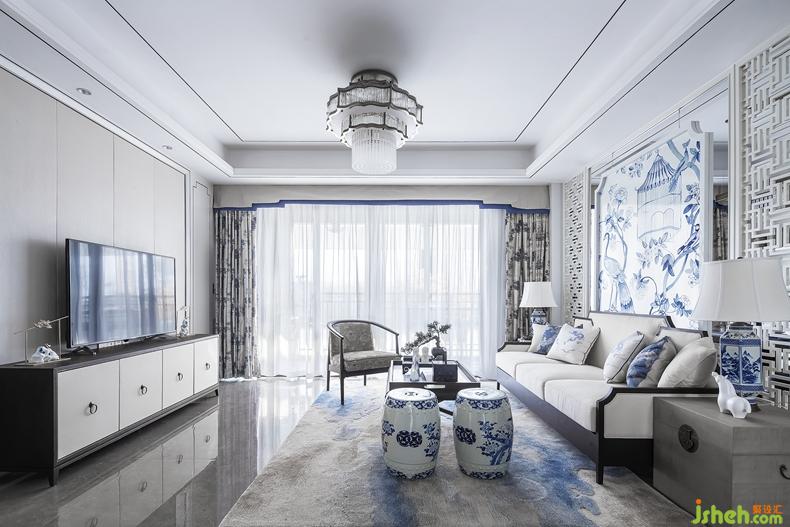 客廳頂部鋪以線條裝飾,精致中也拉闊了空間。白色的頂,白色半透的紗相間藍(lán)色的青花圖案,無不流露出高貴素雅之美??蛷d白色是整個(gè)空間的主體色,藍(lán)色鋪以,營造出一派清秀雋永的青花留白之美。