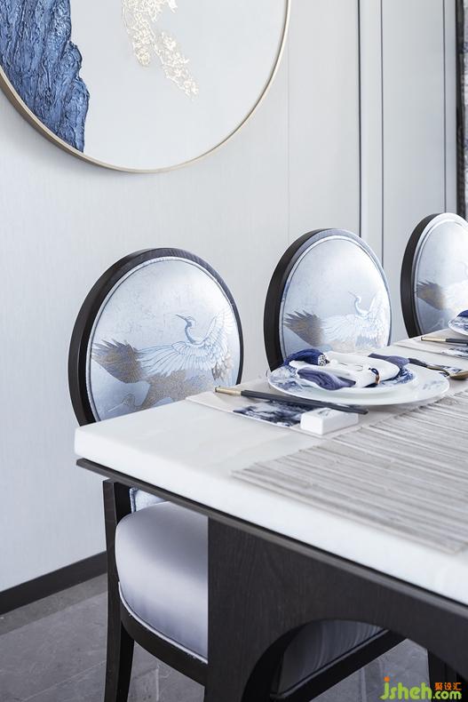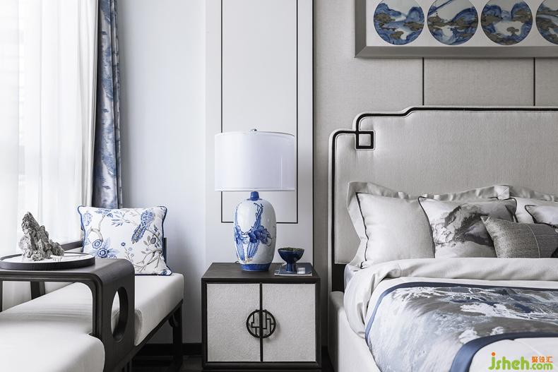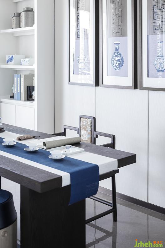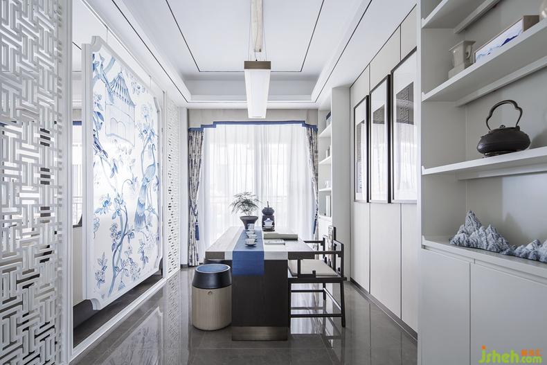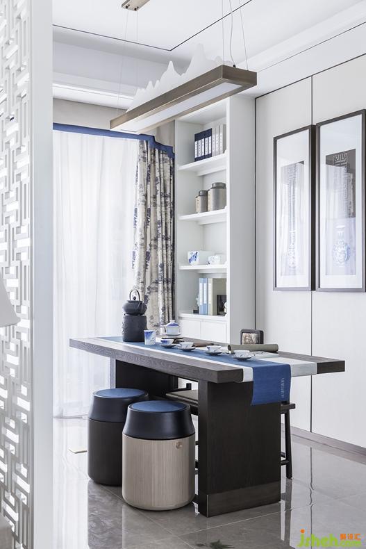 書房里同樣秉承了大廳藍(lán)白色系,青花之美無不顯露,高貴素雅的青白搭配呼之欲出與客廳遙相呼應(yīng)。書房的設(shè)計(jì)渲染著濃厚的書香氣息,現(xiàn)代中式的簡潔設(shè)計(jì)元素在其中,使空間更大氣舒適。