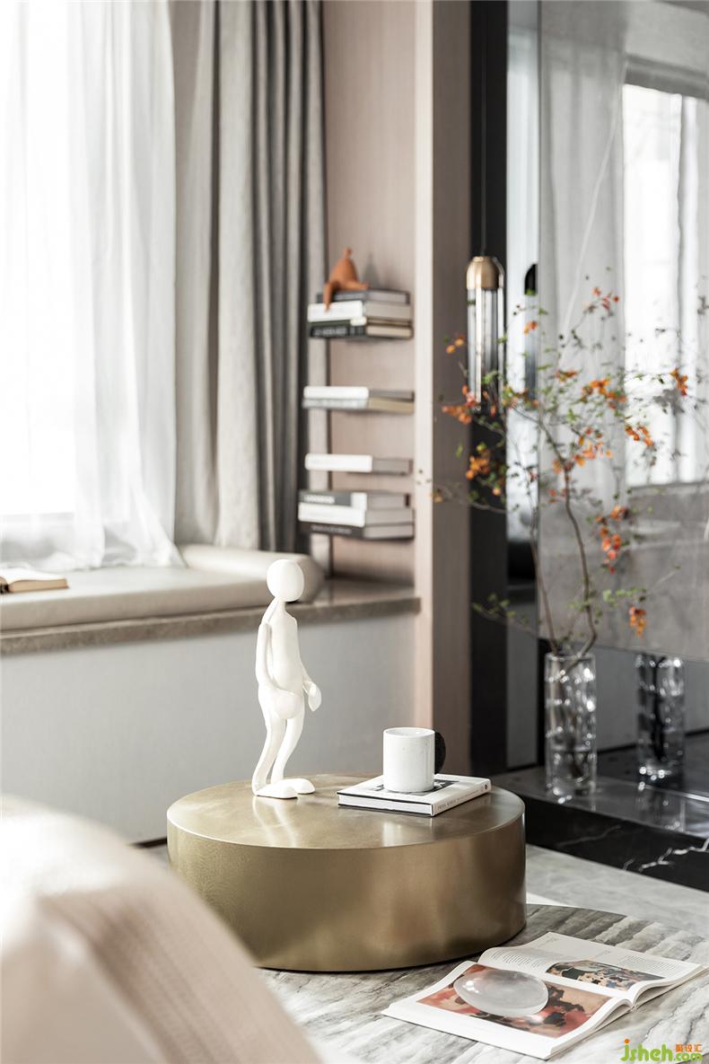 書本、畫冊,甚至愛不釋手的白瓷水杯、人形模具,在金色的臺面上更顯精致,樣板房設(shè)計看似隨性而松散的配置,給足了空間靈性和呼吸。