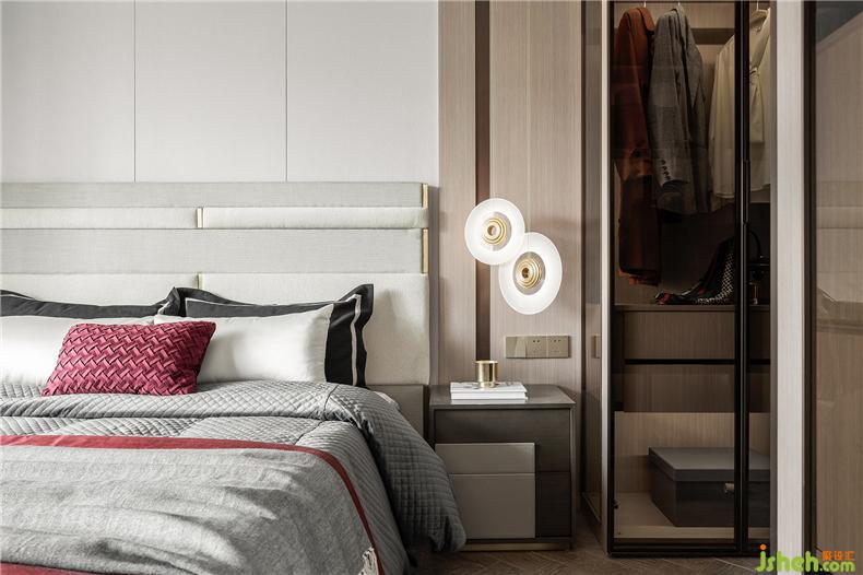 臥室的設(shè)計(jì)延續(xù)了客廳的用意,從墻體到軟裝,淡色調(diào)為主,樣板房設(shè)計(jì)不同灰度的色塊組合拼接,搭配酒紅色的布藝,格外醒目,精細(xì)車線工藝以及絲滑的材質(zhì)盡顯雍容大氣。