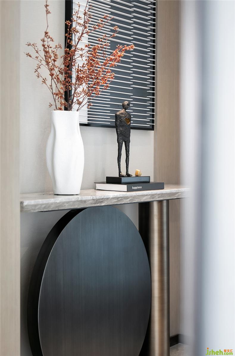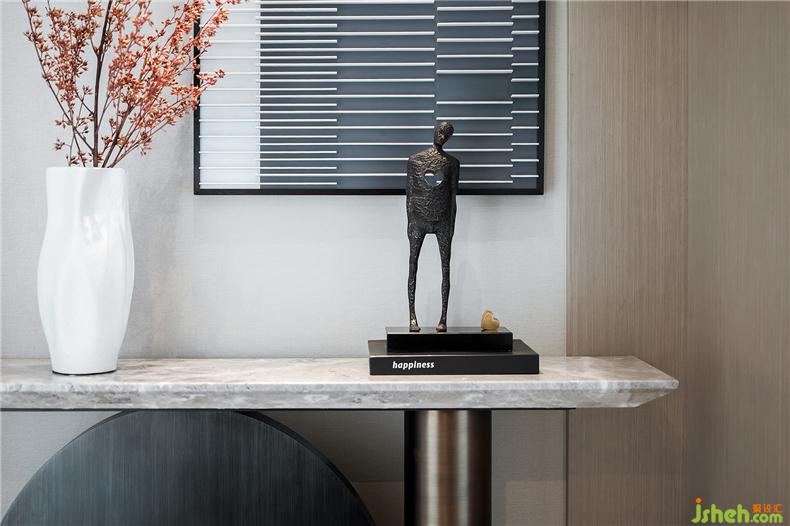 玄關(guān)臺(tái)上冷酷的人物雕塑,遺落了一顆金黃的赤熱之心,這種巧妙借鑒了“解構(gòu)主義”的手法,卻能從色彩到情感,冷與熱的強(qiáng)烈反差,形成了藝術(shù)的沖突之美,也像極了巴德·舒爾伯格在其文學(xué)作品中描述的“精彩極了”和“糟糕透了”的反差式的價(jià)值創(chuàng)造。