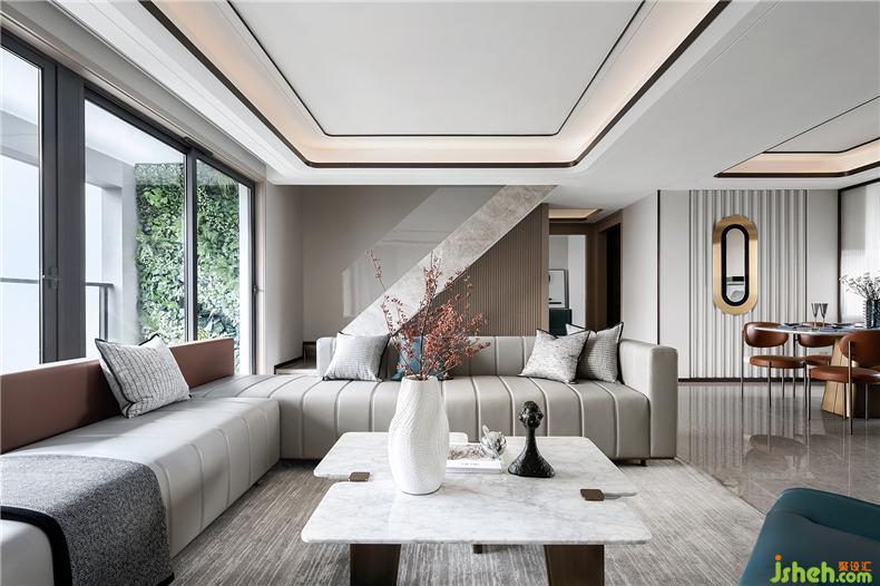 如此靈動(dòng)淡雅的主色調(diào)和帶有高級(jí)灰的硬裝色澤作為客廳空間的主題,樣板房設(shè)計(jì)慵懶柔和中點(diǎn)綴了一個(gè)看似凸兀的雕塑,卻總讓人能感受到一種藝術(shù)設(shè)計(jì)傳遞的精神與力量。