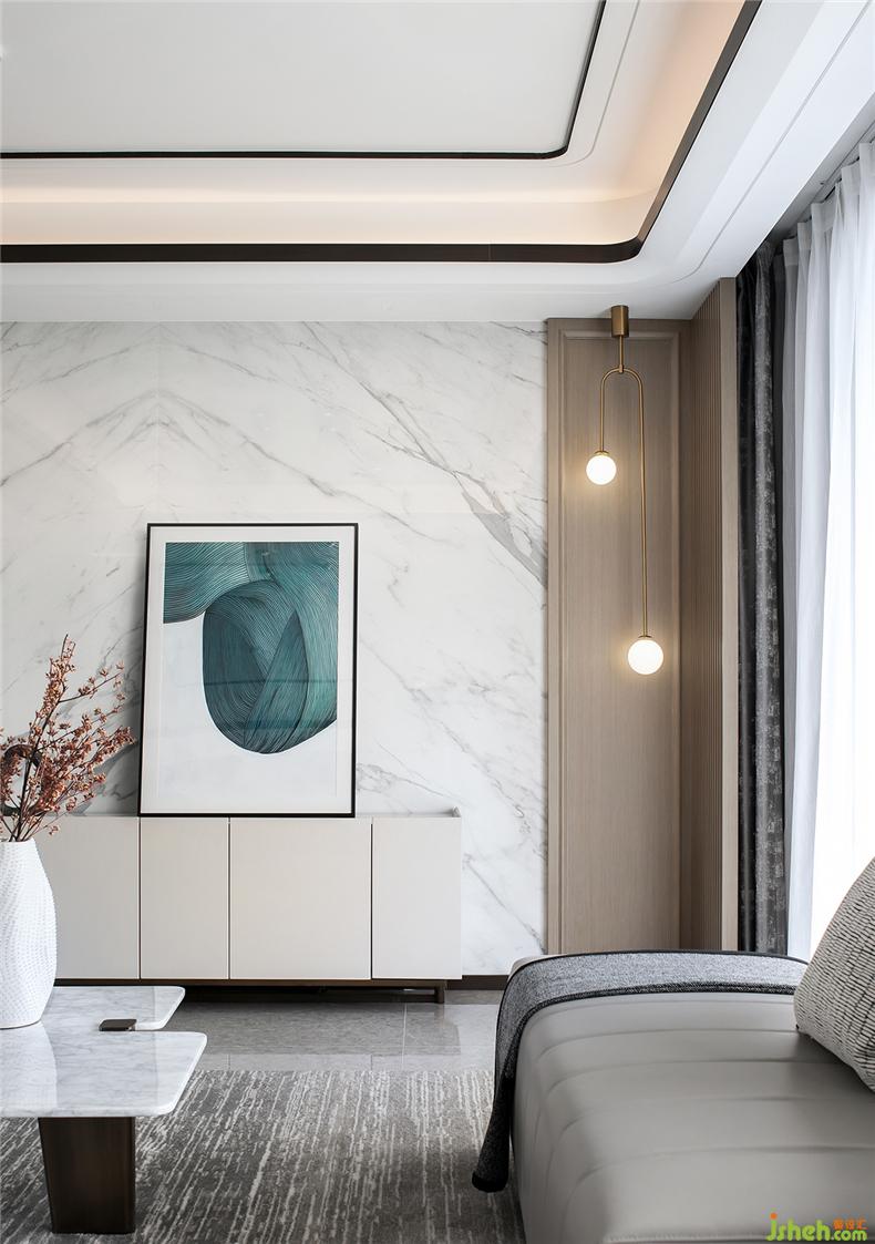 對(duì)于和諧的刻畫,沒有一個(gè)藝術(shù)創(chuàng)造者愿意拋棄“白色系”的,因?yàn)樗侨绱说难胖隆影宸吭O(shè)計(jì)干凈。以潤(rùn)白為韻,在造型上卻恣意變化,從不規(guī)則的茶幾上便可見一斑。