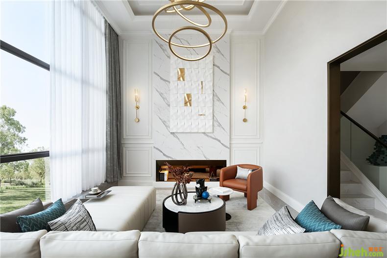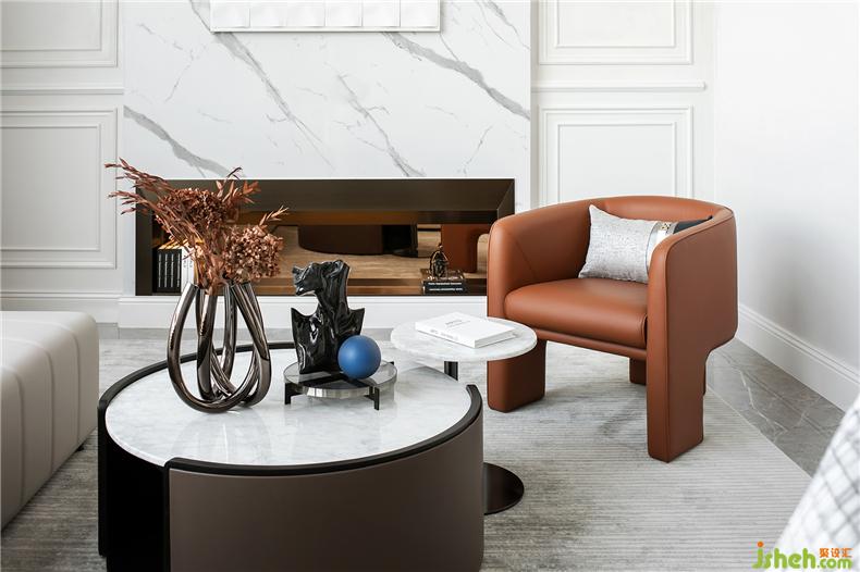 挑高的空間,自帶一種仰望的體量感,呈現(xiàn)了一種自由的精神狀態(tài)。樣板房設(shè)計(jì)沙發(fā)采用精致的灰白色皮料,點(diǎn)綴蒼青色的抱枕營(yíng)造出一種清雅氣質(zhì)。休閑椅的暗橙色綻開(kāi)了空間的時(shí)尚感,淺灰色的地毯、層疊的圓形茶幾,讓空間顯得豐富而有層次。