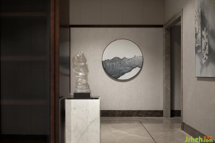 工整、利落的線條有著與生俱來(lái)的秩序感,圓形裝飾畫點(diǎn)綴其中,別墅裝飾營(yíng)造出幾何藝術(shù)感,粗曠的畫質(zhì)面帶著寫意的山水脈理,不經(jīng)意間傳達(dá)出東方大宅的意境之美。