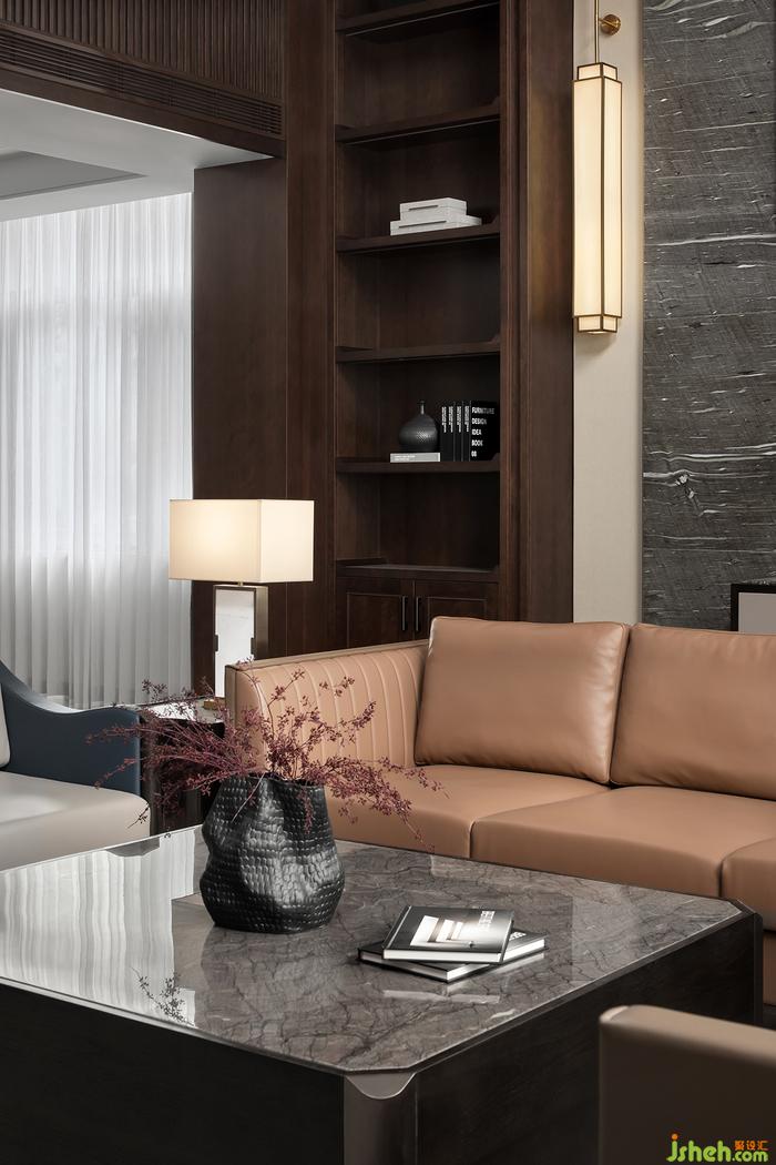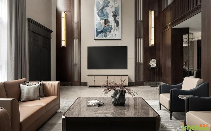 挑高的一層會(huì)客廳,大面積運(yùn)用深色的木飾面,讓整個(gè)空間透著一股淡淡的木香。天然大理石和兩側(cè)裝飾柜相得益彰,裝飾壁燈點(diǎn)綴其中,營(yíng)造出一派書香安靜的大宅氛圍。