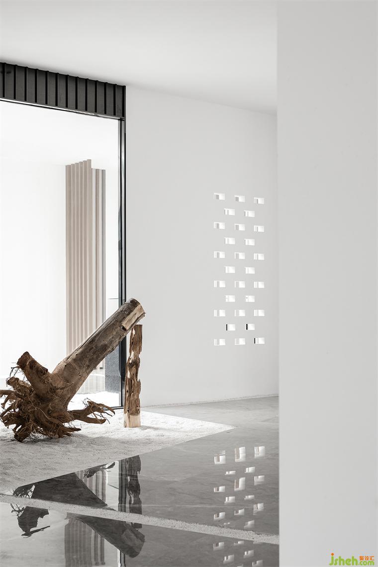 橫向延展的木質(zhì)線條,主導(dǎo)空間走向,為每一停駐的景致增添決定性指引。柔和而深淺錯落的自然色彩,在白、黑、灰的映襯中更顯通透,時光是宇宙最神秘的工匠,在此天賜靈物上,一筆一畫雕刻出歲月走過的印跡,博物館設(shè)計傷痛,愈合,沉寂,繁盛,皆展露無疑,在圍合意境的維度里,為人、器物、光影、線條、色彩注入契合氣韻,共同恪守著神秘的平衡法則。