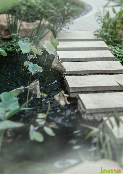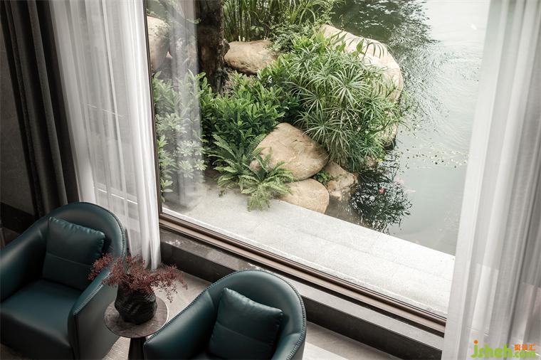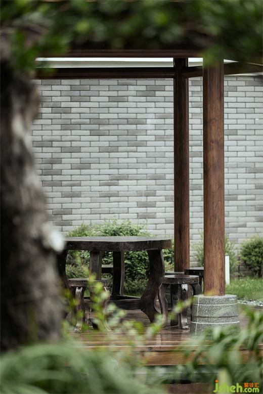 六角的建筑結(jié)構(gòu)搭配經(jīng)歲月浸潤的古樸桌凳,一道道自然紋理隱現(xiàn)來自過去的時間印記,承載居者對家族文脈的精神延續(xù)。閑暇之余,主人可以臨水賞石,也可以與池中錦鯉逗趣,靜享一方院落的愜意時光。