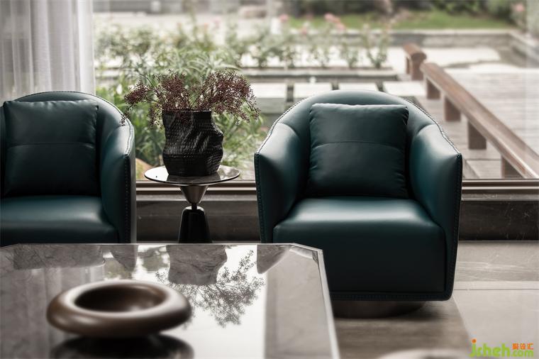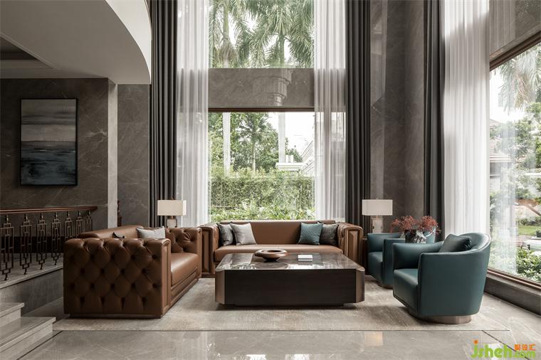 步入客廳區(qū)域,垂直挑空的立面,花園別墅裝修設(shè)計最大化重構(gòu)空間的開闊舒適,向上延展的落地窗,便可將外界的庭院景觀引入室內(nèi)。人、建筑、環(huán)境的界限隨之模糊。