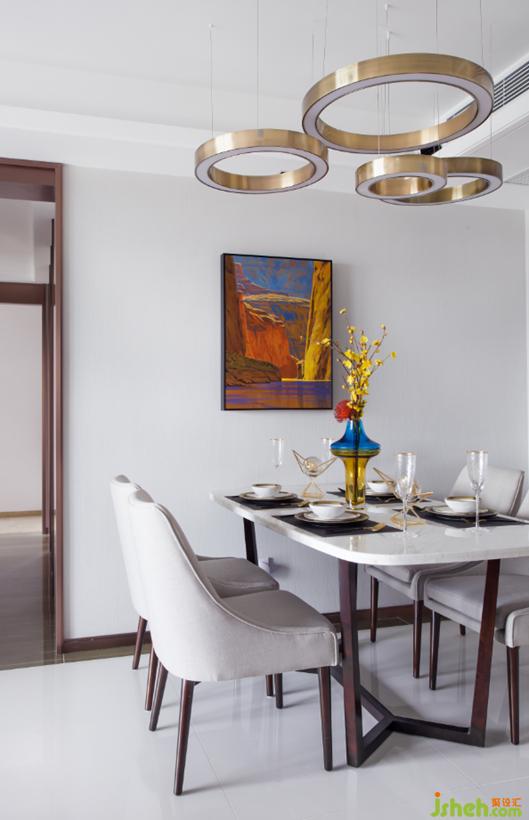 餐廳是客廳部分的延伸,弧線形倒角設計讓就餐氛圍變得更為融洽,掛畫與花藝相呼應,讓整個就餐氛圍變得活躍。