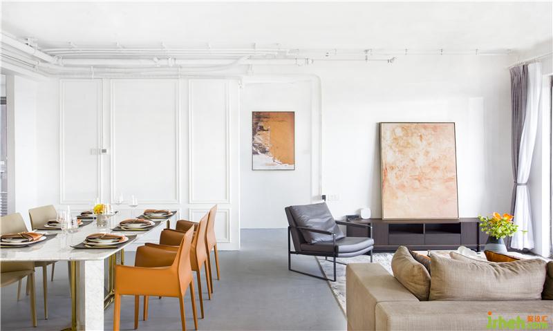 空間從功能性的角度出發(fā),劃分為四個部分,生活起居室,開放式書房、餐廳、及水吧臺,滿足了對居住者對各種生活場景的需求和想象,同時也模擬出一種新的生活路徑。室內(nèi)設(shè)計師
