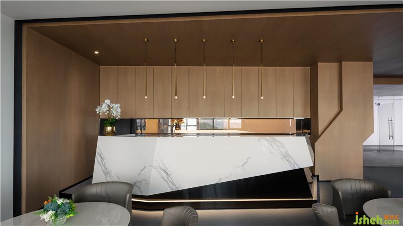 由入口進入室內(nèi),售樓處設計采用山水紋理的大理石的接待臺便映入眼前,傳達氤氳的氣息,使接待中心各個空間流暢而富有變化,與線條型的燈光樣條遠近呼應,營造出包容氣質(zhì),似乎也 在隱隱的傳達這座城市的容貌,慢慢的深入,漸漸展露它的真實面容。