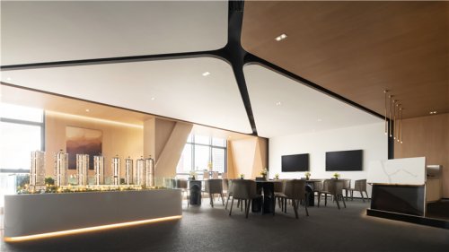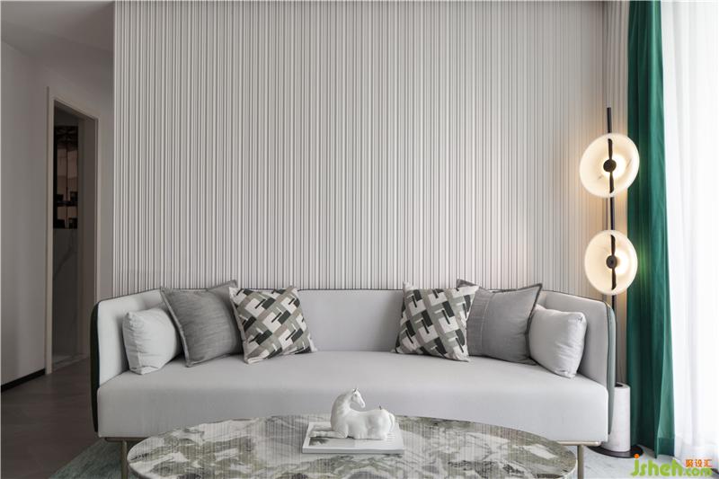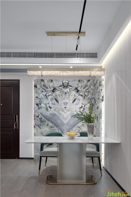 客餐廳最鮮明的痛點莫過于廚房的開門位置太過于接近客廳,樣板房設計為了保持空間整體的一致性,同時對各功能區(qū)作出劃分;