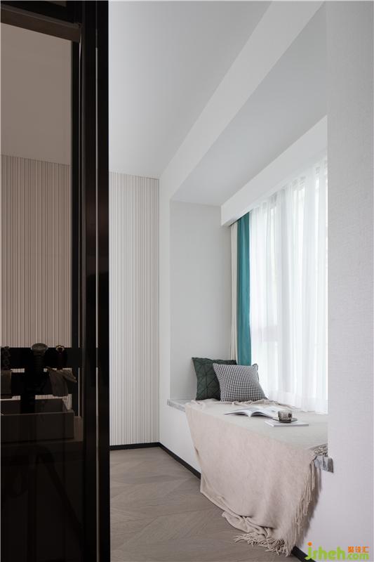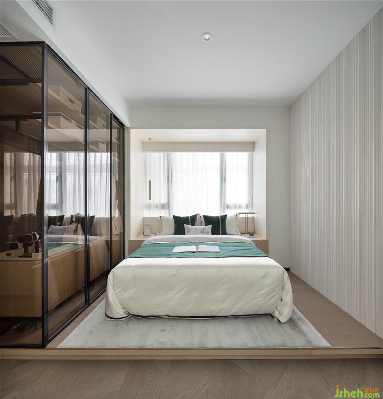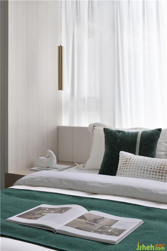 我們通過木地臺把榻榻米抬高的做法,樣板房設計讓床位和床頭柜可以恰如其分的嵌進飄窗里,改變床位走向的同時,把床位定格在了一個迷人的高度。
